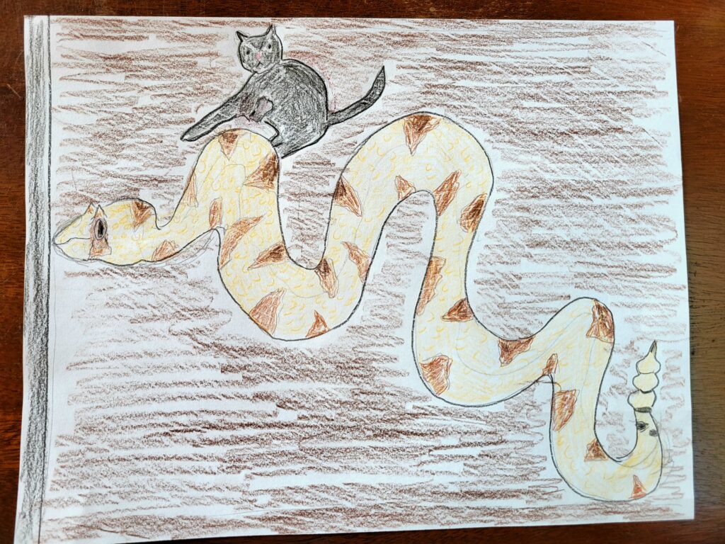 Next scene: Now it feels like I am in Shady Oak’s garage. Paul is there. He has taken the tarp I used for the tent and put it on the horse’s back. Now there is a huge side-winder rattlesnake that starts from the back of the garage and winds its way out. John Hedren is in the garage as well. I tell Paul and him about the snake (though it is pretty obvious!). As the snake makes its way out of the garage, my cat playfully jumps on it a couple of times. The snake ignores her and does not bite or attack her. After the snake leaves the garage I put the tarp back and rearrange things so animals, especially snakes cannot get in.