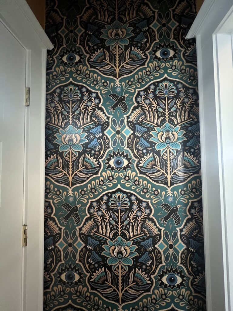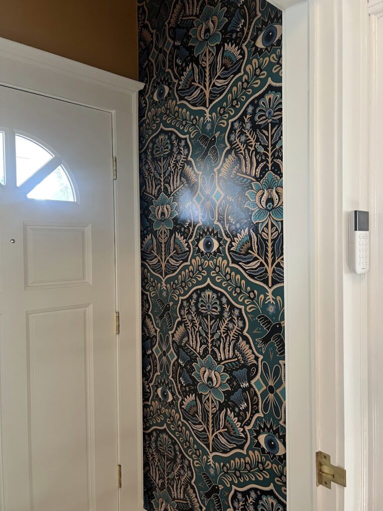 My friend Denisea recently added folk-art wallpaper (third-eyes, flowers and ravens) to my front entryway. Her friend Lindsey helped. It has felt like a simple enhancement. A new space.