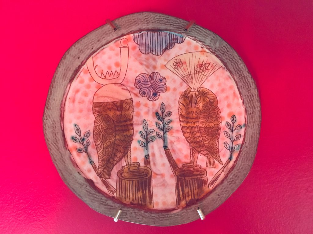 (Above photo is my owl plate by Shoko Teruyama. I also have a porcelain cup by Shoko that depicts a white owl smoking a pipe.)